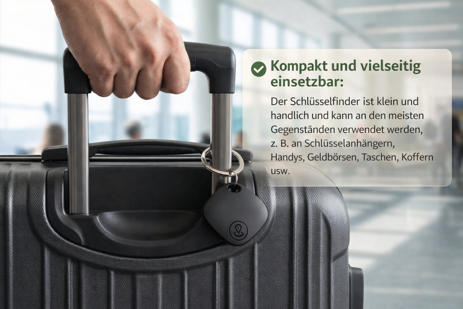 Dieser Tracker wurde entwickelt, um Ihnen die Sicherheit zu geben, dass Sie Ihre Wertsachen im Auge behalten, egal wo Sie sind. Ganz gleich, ob es sich um Dinge des täglichen Bedarfs oder um Gegenstände handelt, die Sie auf Reisen mitnehmen, sorgt dieser Tracker dafür, dass Sie immer wissen, wo sie sich befinden.