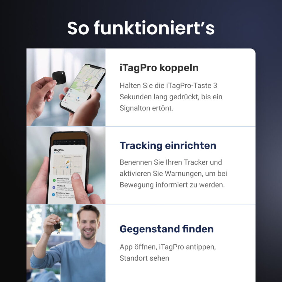 Das Koppeln dauert nur ein paar Sekunden! Führen Sie diese 3 einfachen Schritte aus, um Ihre Wertsachen zu überwachen und genießen Sie Ihren Seelenfrieden