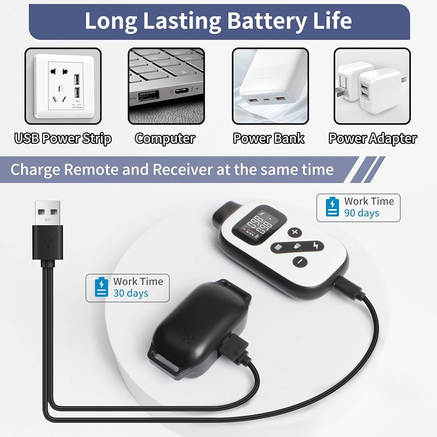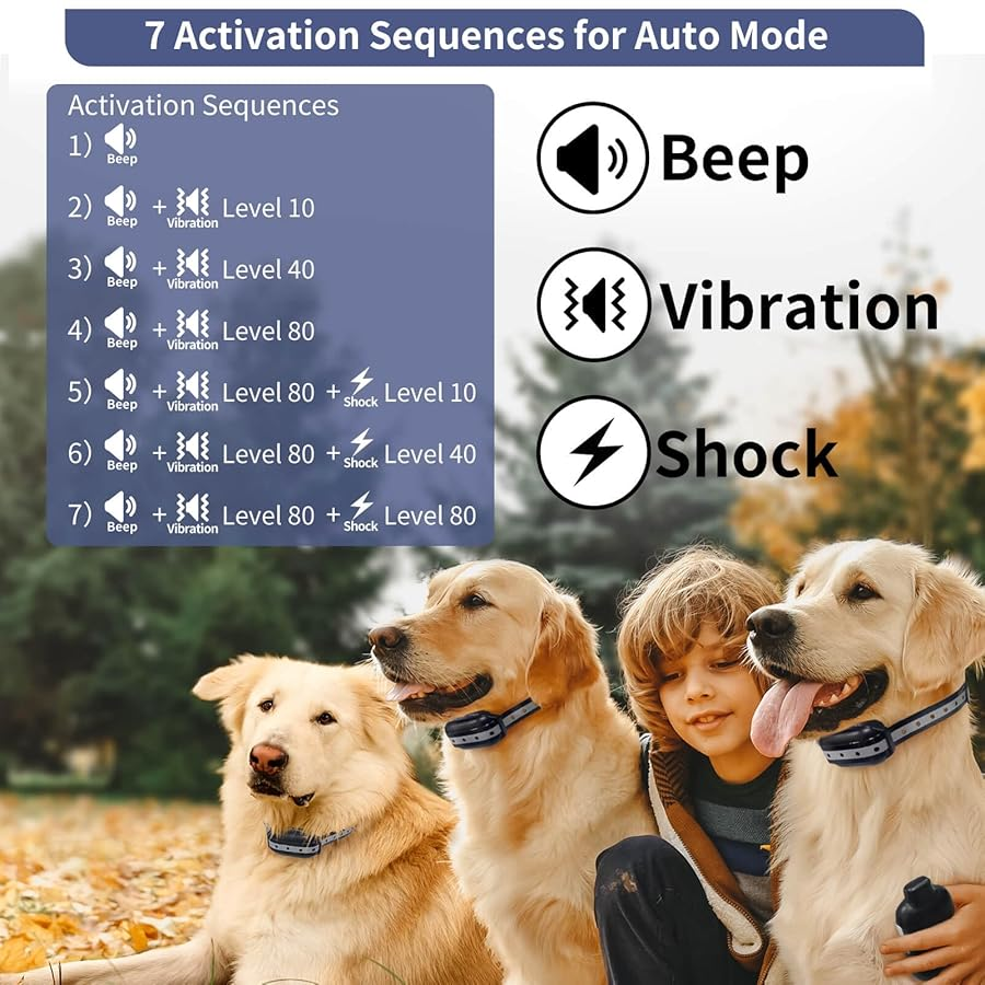 【4 Trainingsmodi】Das Gerät verfügt über mehrere Trainingsfunktionen: Schockstufen (1–100), Vibrationsstufen (1–100), Signalton (Beep) sowie einen automatischen Anti-Bell-Modus. Die Intensität kann individuell angepasst werden.